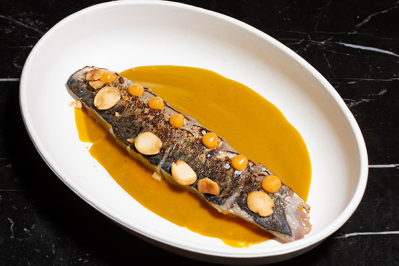 Caballa soasada con curry de zanahoria y mayonesa de chipotle.