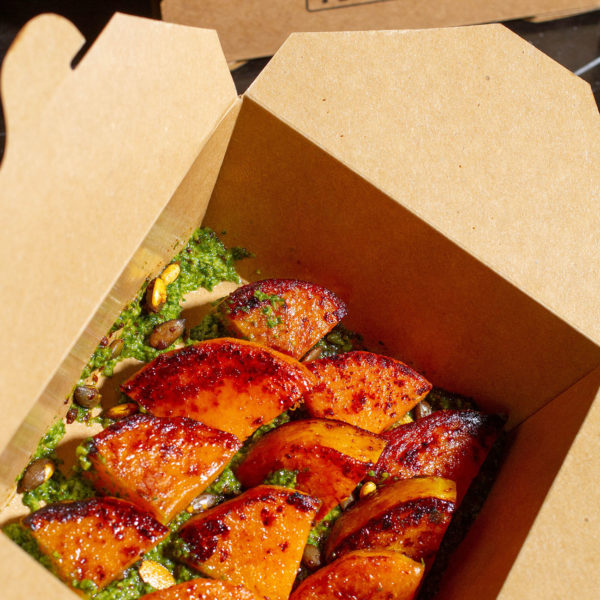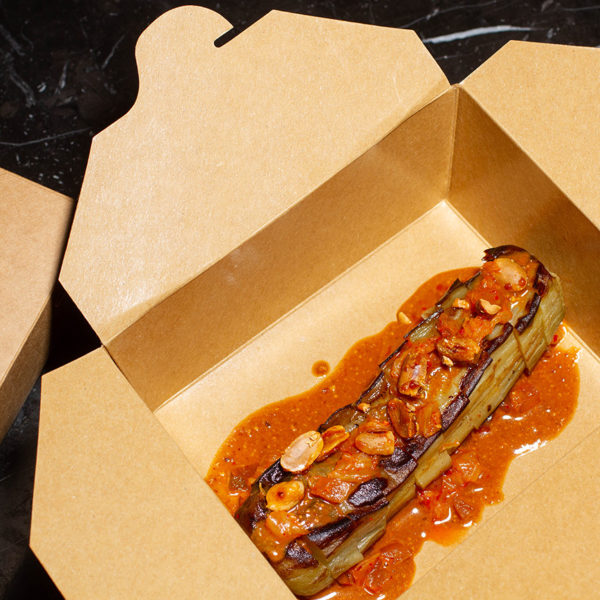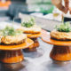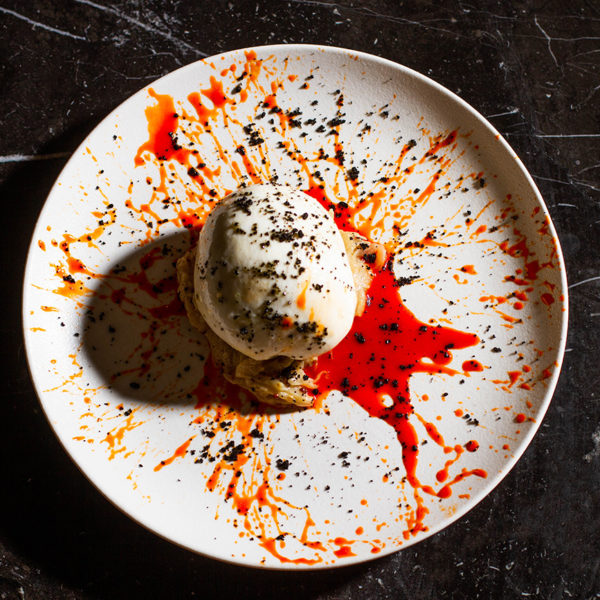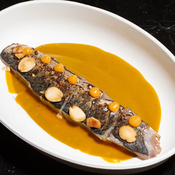 Ensaladilla de gamba roja con patata, zanahoria, judía verde, gamba salteada y mayonesa de crustáceos.